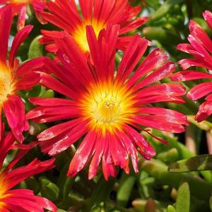 Succulent, evergreen groundcover. In areas colder than zone 7 they are semi-evergreen and not reliably winter hardy. Fleshy, cylindrical, green leaves. Daisy-like flowers bloom through summer in a variety of colors such as red, orange, pink, yellow and white. Great for desert and rock gardens, as a groundcover or edger.