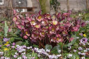 Clump-forming, late winter blooming perennial. Large, cup-shaped, generally nodding flowers in a range of colors and bicolors such as white, yellow, pink and purple with contrasting yellow stamens. Flowers are usually held in clusters at the top of thick, flowering stems. Blooms from late winter to spring. Wide, palmate, glossy green leaves sprout from the crown. Foliage is evergreen in warmer climates and deciduous in very cold climates. Great under shady trees and large shrubs, in borders and woodland gardens.