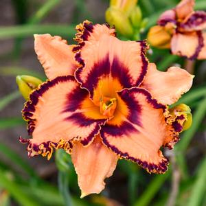 - Apricot-orange flowers with dark purple edges and dark purple eye, orange center