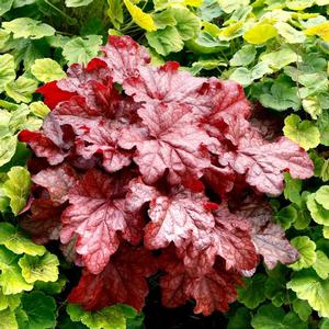 Prized for its foliage colors and textures. Heuchera adds color and interest to the shade garden. Foliage typically comes in hues of silver, burgundy, peach, pink, red, chartreuse, and purple with contrasting veining. Tiny, bell shaped flowers appear above the foliage in late spring-mid summer. Low growing, mounding habit. Perfect choise for borders, containers, rock gardens, and mass plantings.