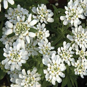 Low-growing, spreading, woody-based perennial. Evergreen in warmer climates and semi-evergreen in areas with very cold winters. Small white flowers in dense, flattened clusters bloom in early to late spring. Oblong, narrow, leathery, green leaves. Great for rock gardens and as an edging plant for borders and walkways.
