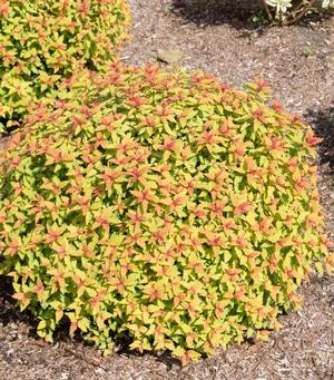 Dense, upright, mounded, deciduous shrub with oval, toothed, green, blue-green or chartreuse leaves. Tiny red, pink or white flowers in flat-topped or rounded clusters bloom from late spring to mid-summer, sparse and intermittent repeat blooming may occur. Great for rock gardens, shrub borders as a specimen or a low hedge.